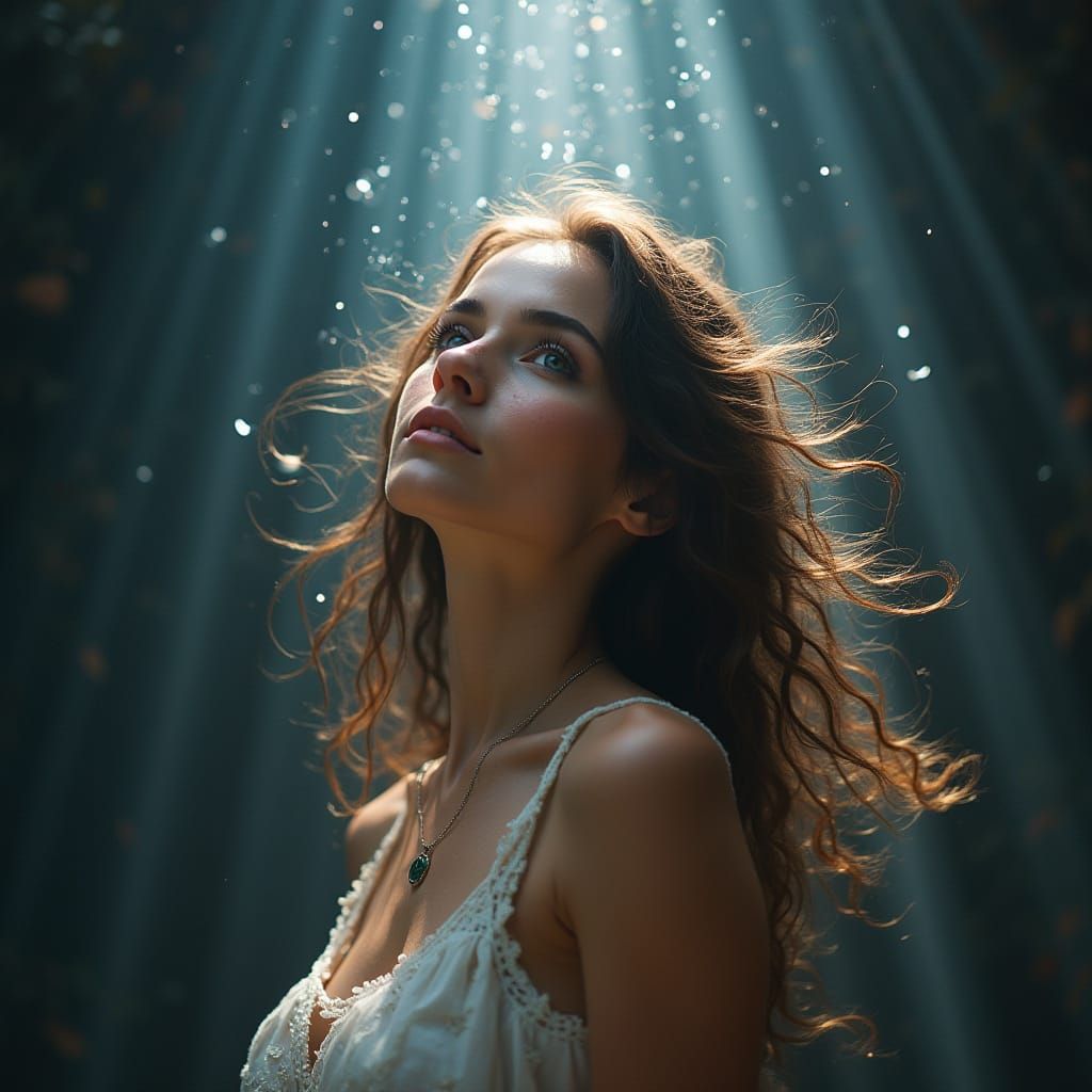 This image depicts a woman with her hair flowing in the wind, surrounded by a soft golden aura and set against a starry night sky, created in a realistic and spiritual art style.