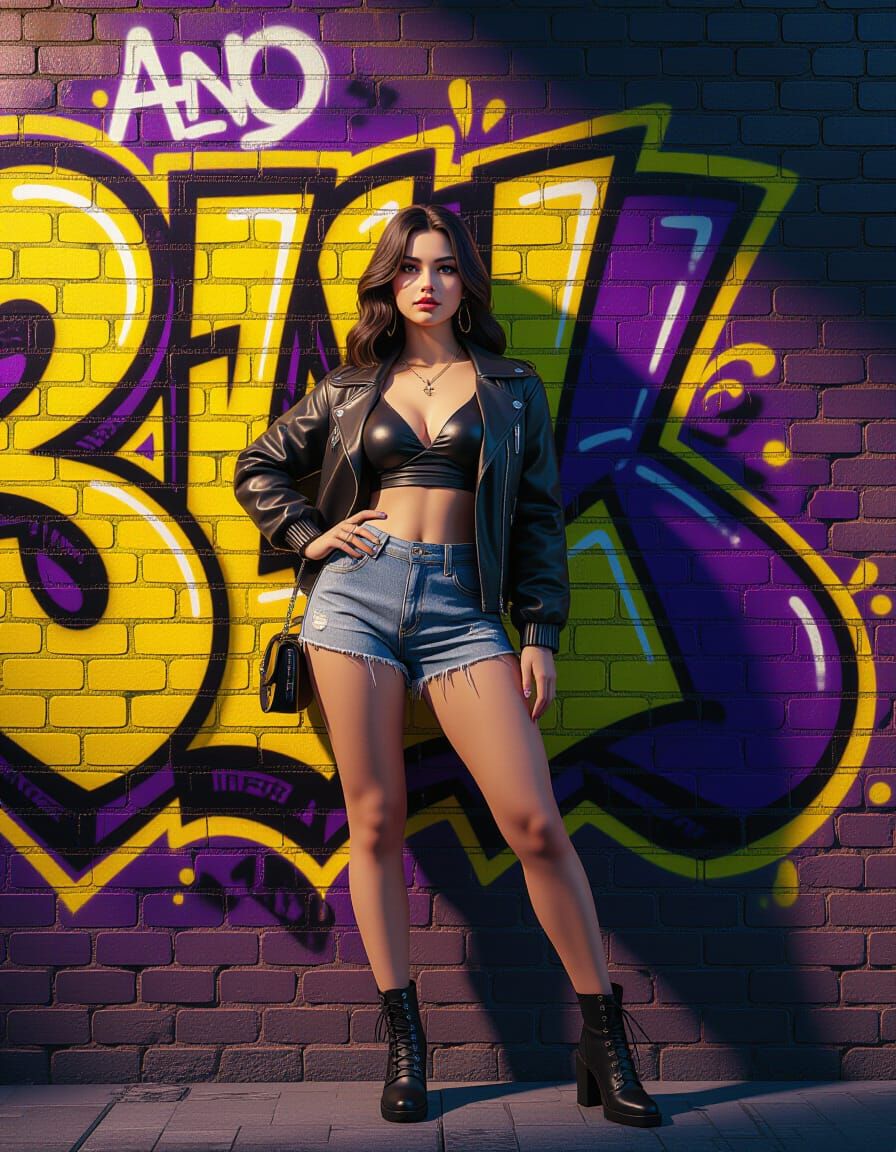 A striking image of a stylish, curvaceous woman against a graffiti wall. Features dynamic lighting and deep complementary colors, rendered with intricate, painterly detail in a dark fantasy concept art style.