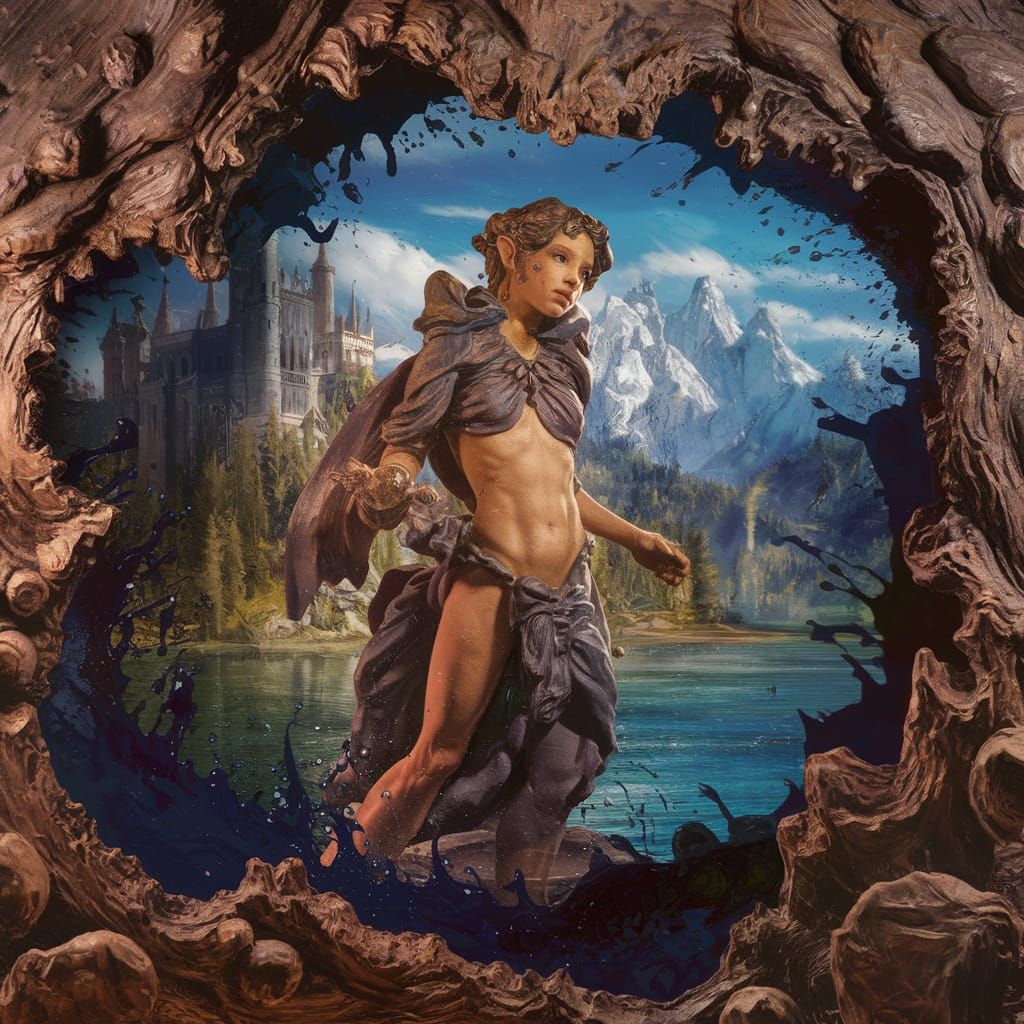 This image shows a young woman with a sculpted body standing on a rocky surface near a serene body of water, with a majestic castle and mountain range in the background, rendered in a detailed and vibrant 8k matte painting style.