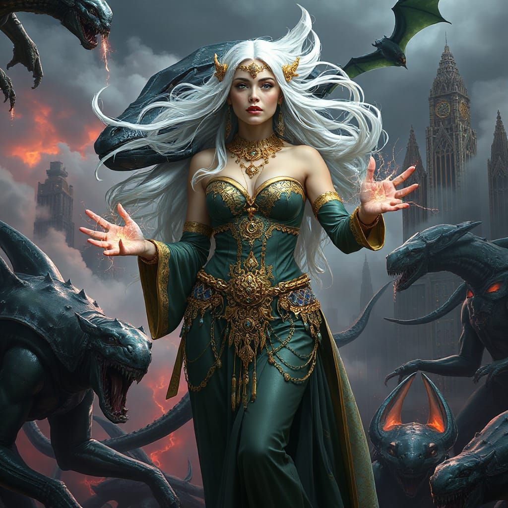 A mystical sorceress with flowing white hair and intricate gold jewelry levitates in a dark, cloudy city, surrounded by alien creatures, as she casts a spell with crackling energy.