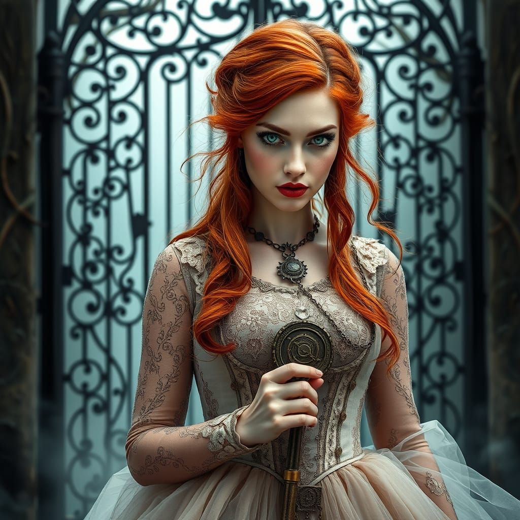 This image shows a stunning elven queen standing before a mystical gate, surrounded by intricate steampunk-inspired details and arcane energy. The queen's piercing emerald eyes and fiery red hair are captured in sharp focus, with a shallow depth of field and dramatic studio lighting.