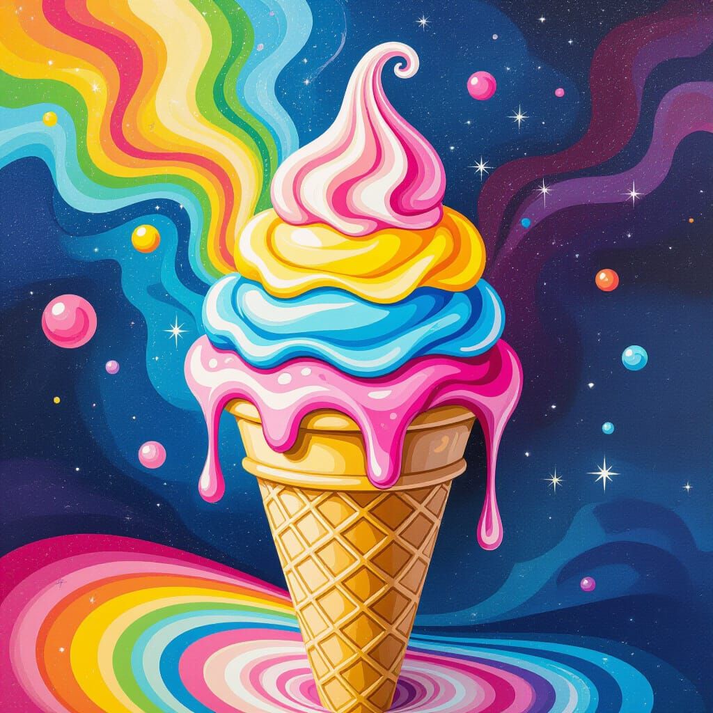 This image shows melting ice cream in vibrant, swirling colors. It evokes a wonderland aesthetic, rendered as a detailed gouache painting with rich textures.