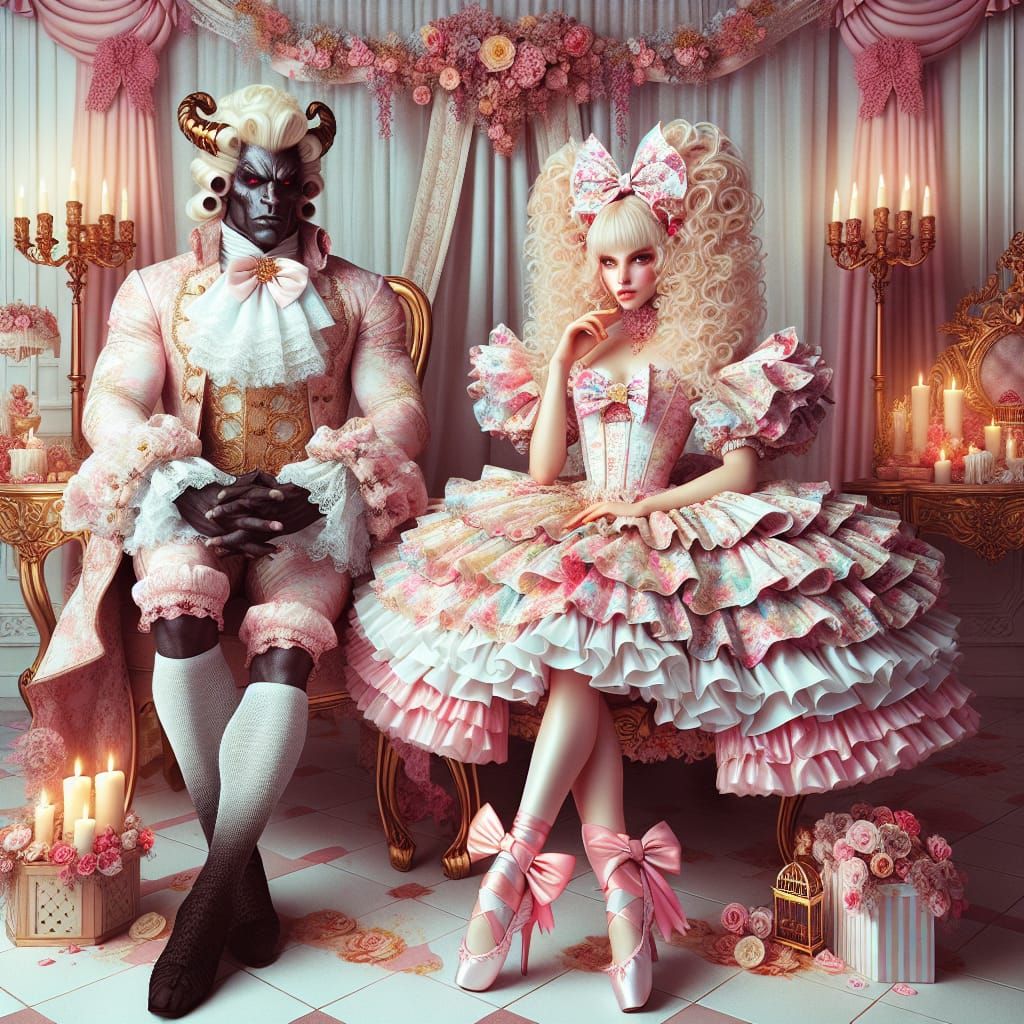 A striking picture of a demon king with a woman in an opulent bedroom. The woman wears a short, puffy ballerina dress with long, blonde pigtails. The scene is rendered in pastel hues.