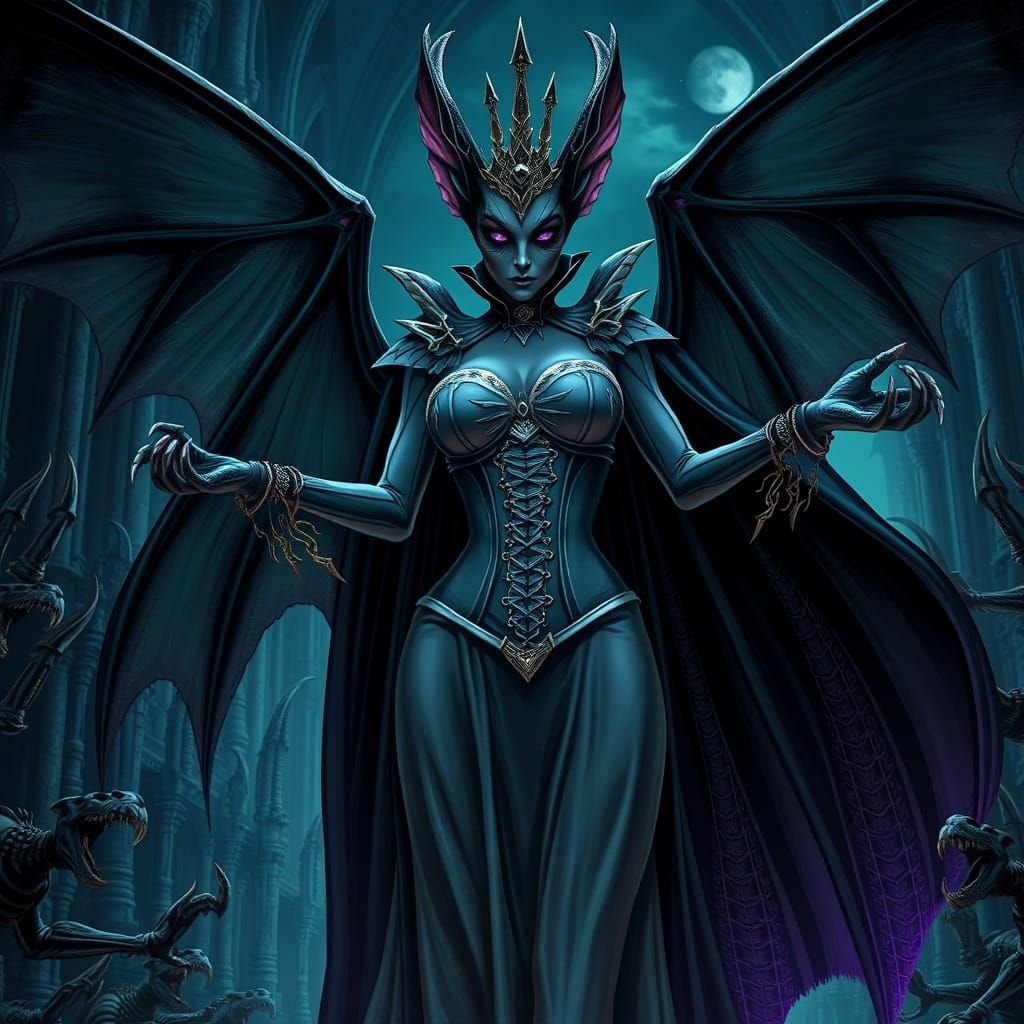 This image shows a dramatic, anthropomorphic bat monarch standing in a gothic cathedral constructed from obsidian bones. She wears a Victorian-inspired corset and flows cape with subtle violet trim, exuding dark, mystical energy.