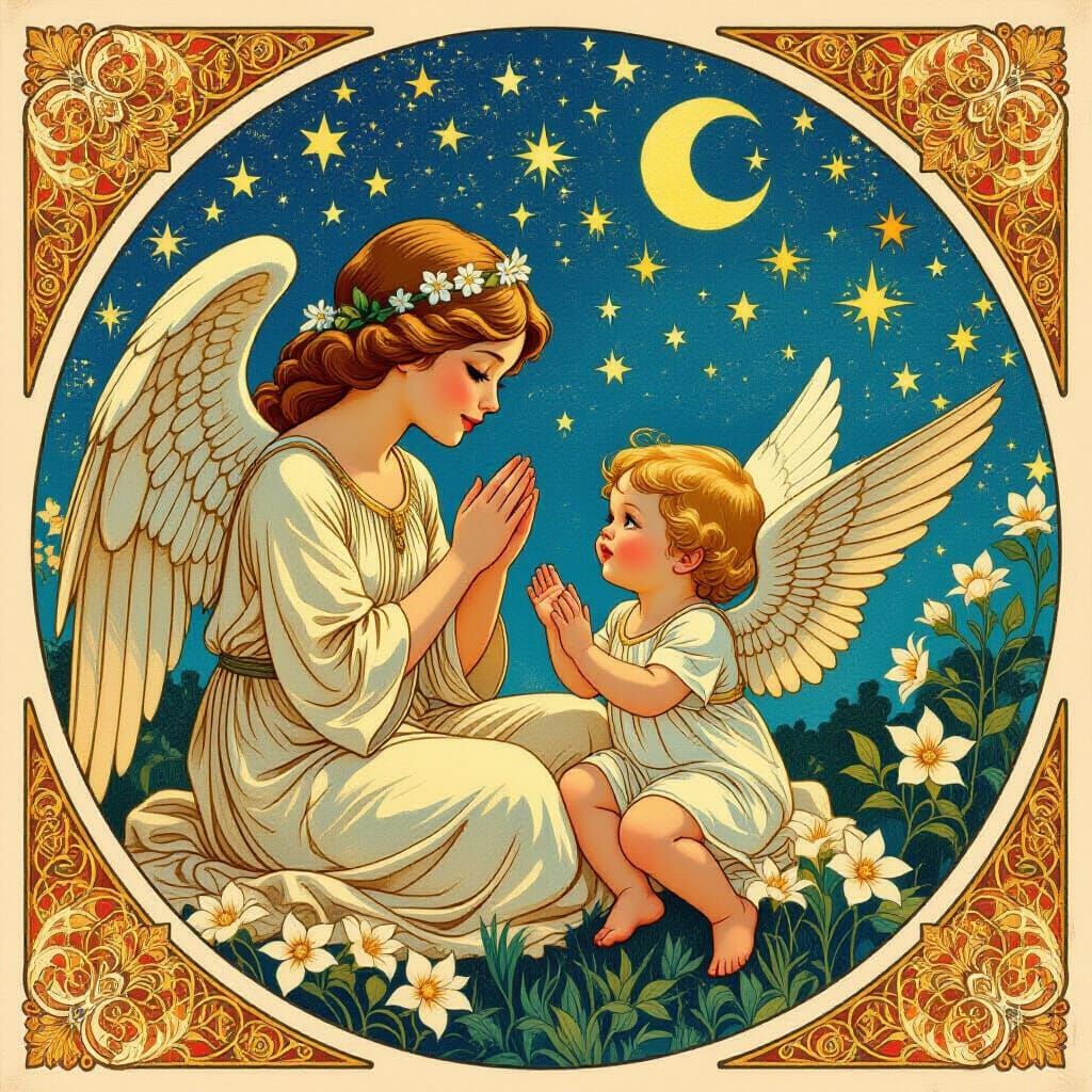 This image depicts stone angels with babies in a garden blending Art Nouveau and Art Deco styles, under a starry sky with Van Gogh inspired brushwork. Rendered in a painterly style with luminous lighting and rich colors.