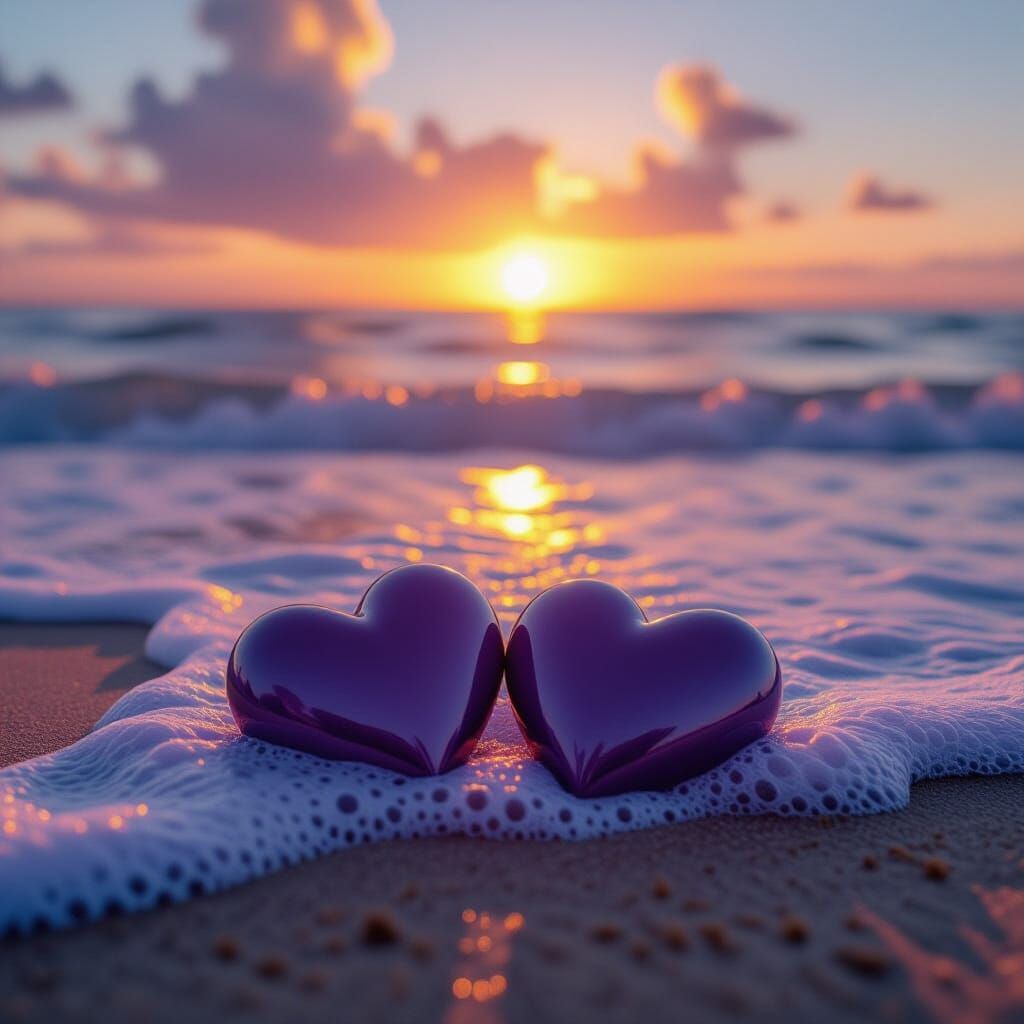 This image shows two purple hearts on a beach with waves and a sunset. It has a cinematic, atmospheric feel with film grain and warm colors.