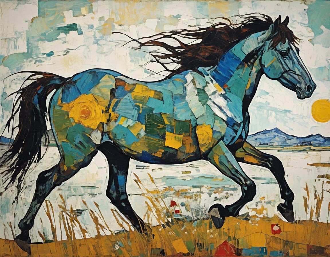 This image depicts wild horses in a bold, expressive style reminiscent of Egon Schiele and Helene Schjerfbeck, with a dash of Roy Lichtenstein's pop art flair and a nod to the emotive brushwork of Vincent van Gogh.