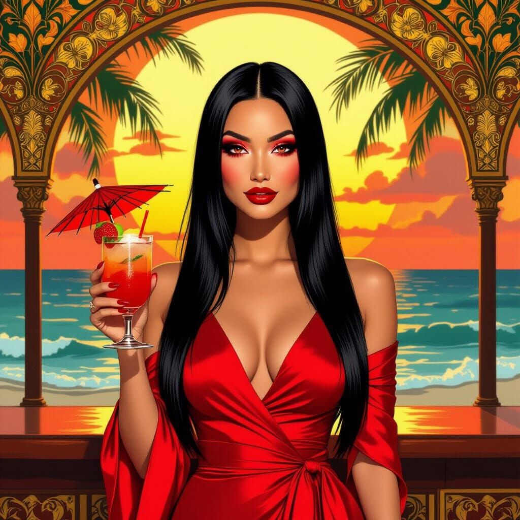 A striking portrait of a woman with black hair and red highlights, wearing dramatic makeup, beneath glowing palms at sunset. The image features intricate art nouveau patterns and vibrant colors.