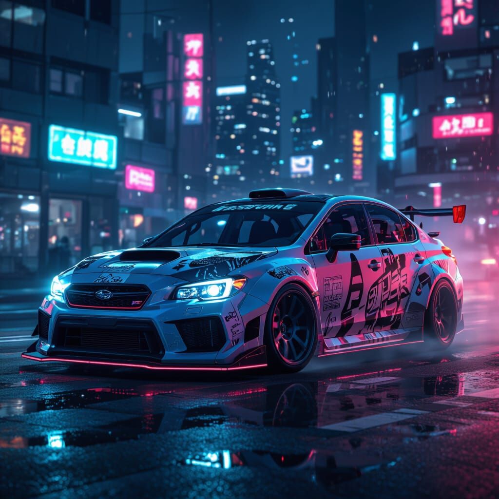 This image showcases a Subaru with spy decals, drifting modifications, and neon lights in a futuristic urban environment. The car is rendered in a cyberpunk aesthetic with cinematic lighting.