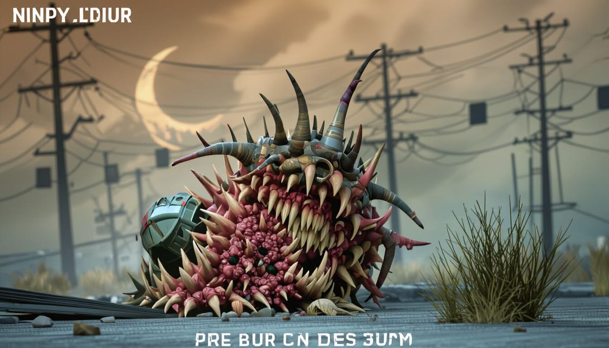 A realistic image shows a mutated, horned monster devouring a human in a post-apocalyptic setting. The creature has irregular scales and the scene features detailed textures and dramatic lighting.