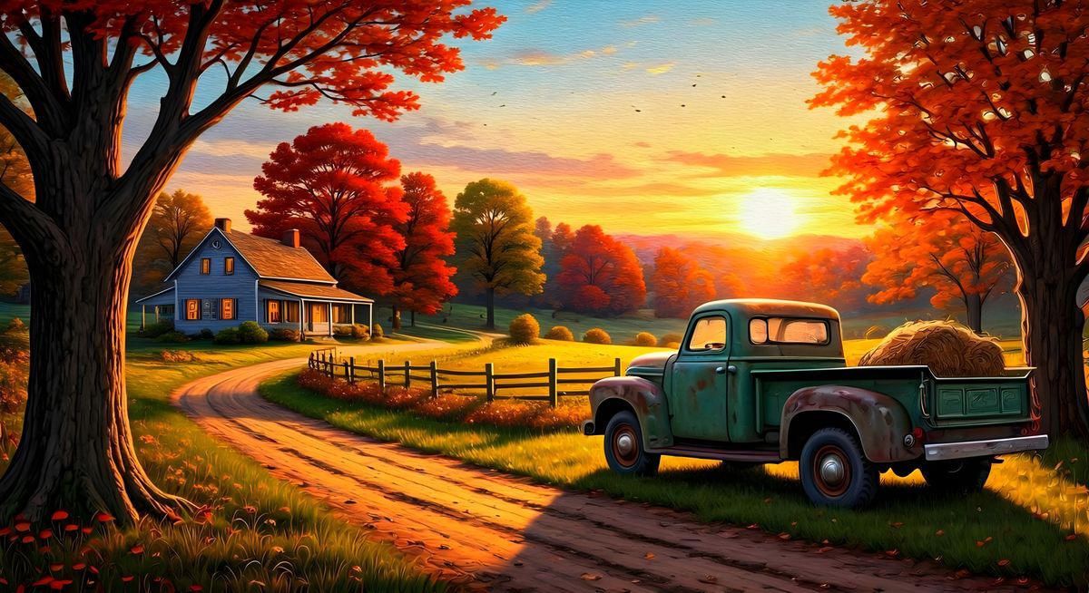 This image showcases a serene autumn country scene at harvest time, rendered as a vintage oil painting. It features a charming farmhouse, a dirt road, and a sunset, evoking a nostalgic Americana feel with warm, vivid lighting.