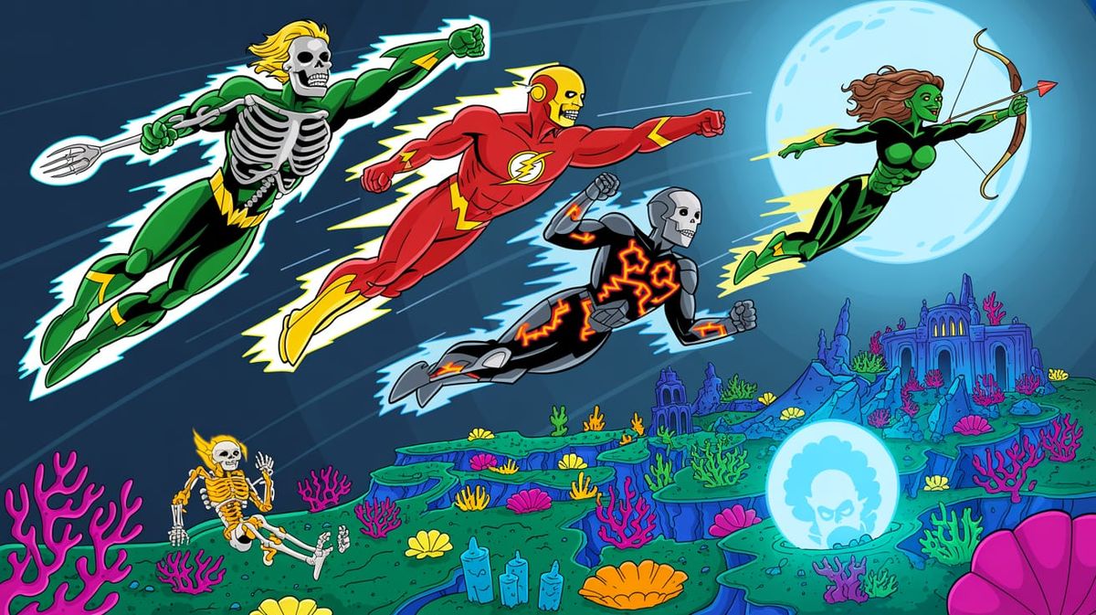 <lora:Ink Poet:1.0> <lora:Akimora:1.0> A cartoon-style skeleton Aquaman, skeleton Flash, skeleton Cyborg and skeleton Hawkwoman soar through the night sky, rendered in a flat, simple style with bold outlines and solid colors, reminiscent of a Saturday morning cartoon. They are flying over a cartoon ...