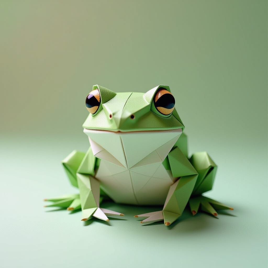 This image showcases a serene frog crafted from folded origami paper. The papercraft is presented in high resolution with a soft focus effect, highlighting intricate details.