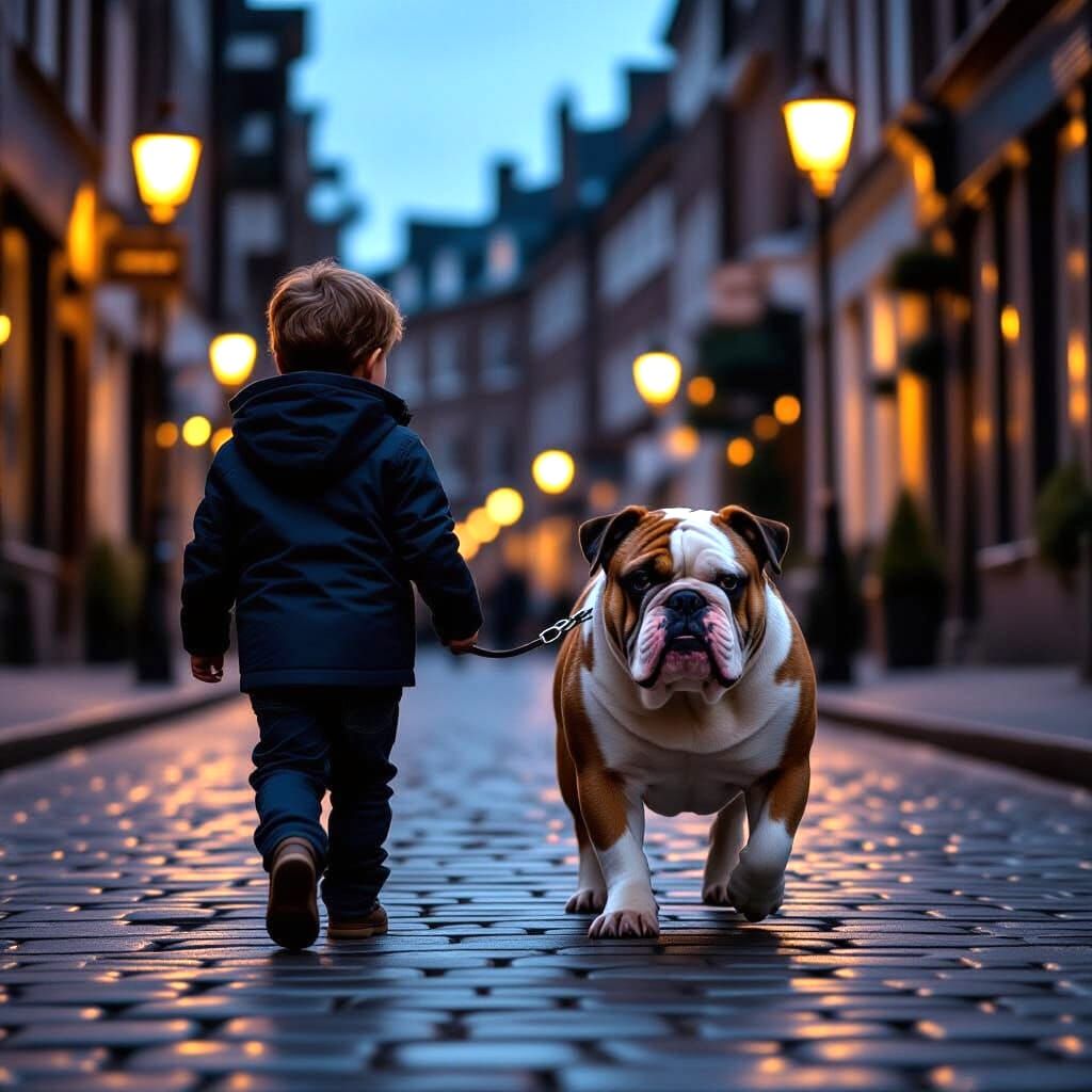 This image captures a boy walking his English bulldog in a dramatic, atmospheric scene. Shot with a cinematic aesthetic, it features film grain and rich color grading for a high-quality, live-action feel.