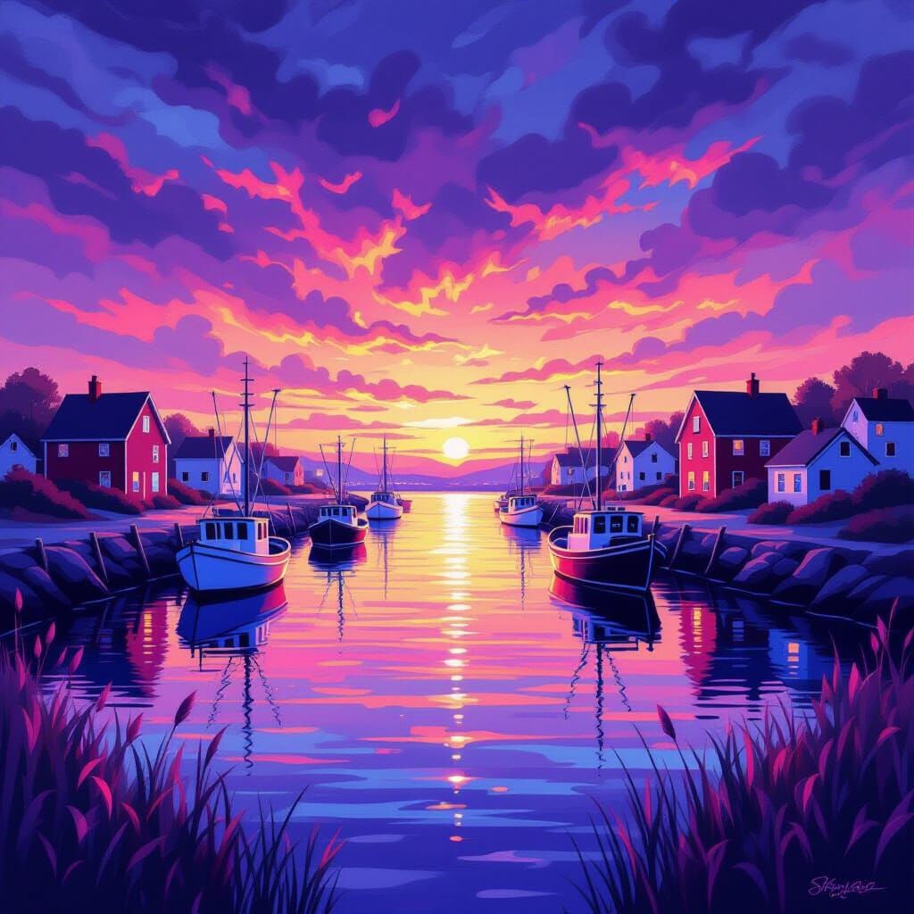 This vibrant artwork captures a harbor town with boats and cottages under dramatic, colorful skies. Reflections shimmer on smooth water, rendered with bold, painterly strokes and luminous light.