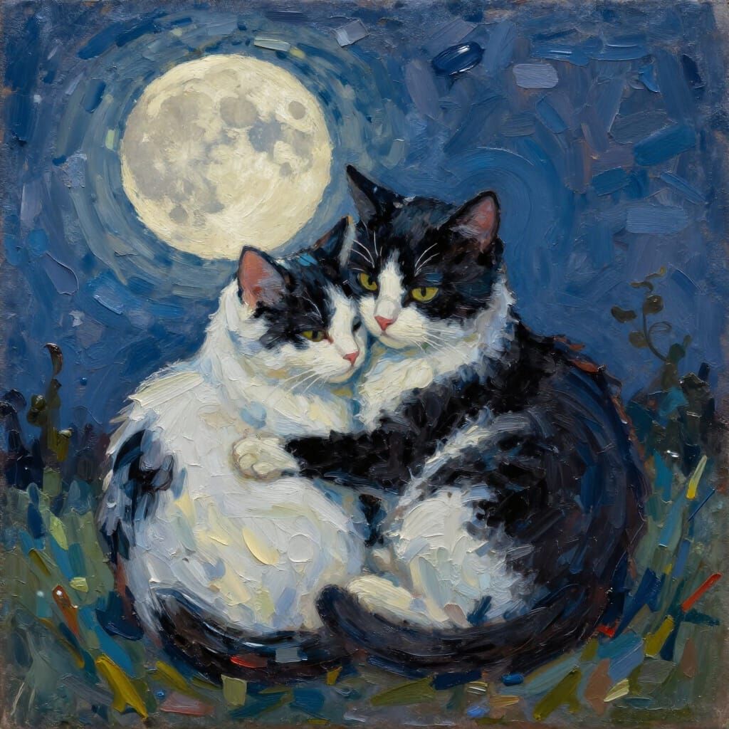 This image shows two black cats cuddling together beneath a full moon. The artwork is rendered in a vibrant impasto style with thick, textured paint, evoking a neo-impressionist feel.