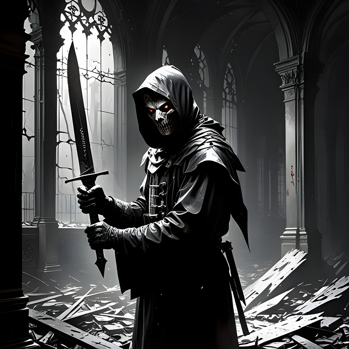 A sinister image of someone cut, rendered in a mix of gothic, Art Nouveau and brutalist styles. The artwork evokes a sense of horror and harm through ominous and mysterious elements.