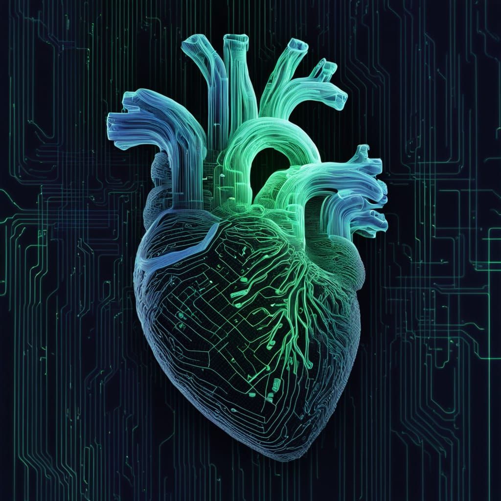 This digital art showcases a human heart formed from luminous, flowing lines of computer code. Binary digits stream through it like vessels, pulsing with green and blue light in a dark void.