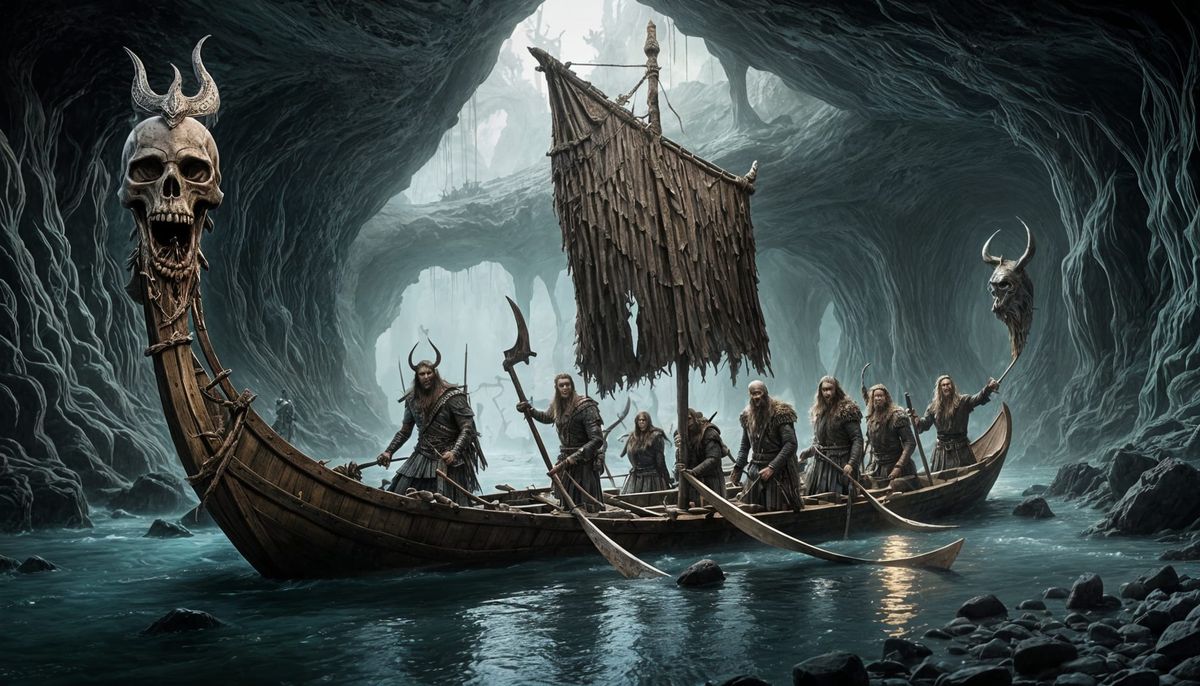This image shows a Viking longship navigating a river cave at night, carrying skeletal Viking warriors to the underworld. The eerie scene depicts a journey to Valhalla.