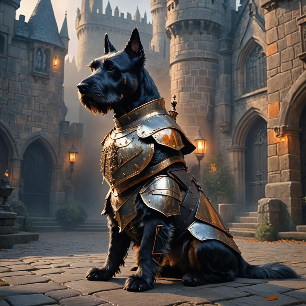This image shows a Scottish terrier in shining armor sitting in a misty medieval courtyard. The fantasy concept art features intricate pen and ink illustrations with rich golden light and deep blues.