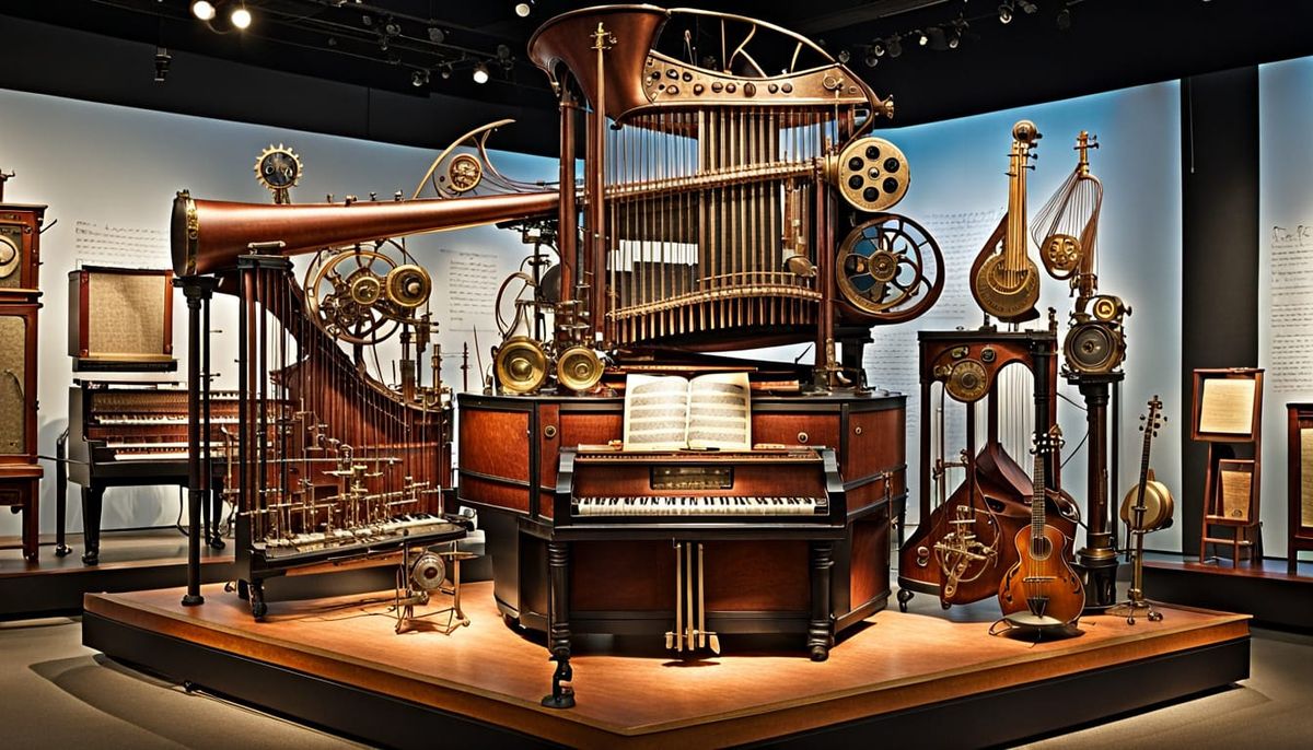 This image showcases a museum exhibit filled with intricate steampunk-themed musical instruments, featuring gears, brass, and Victorian-era design elements.