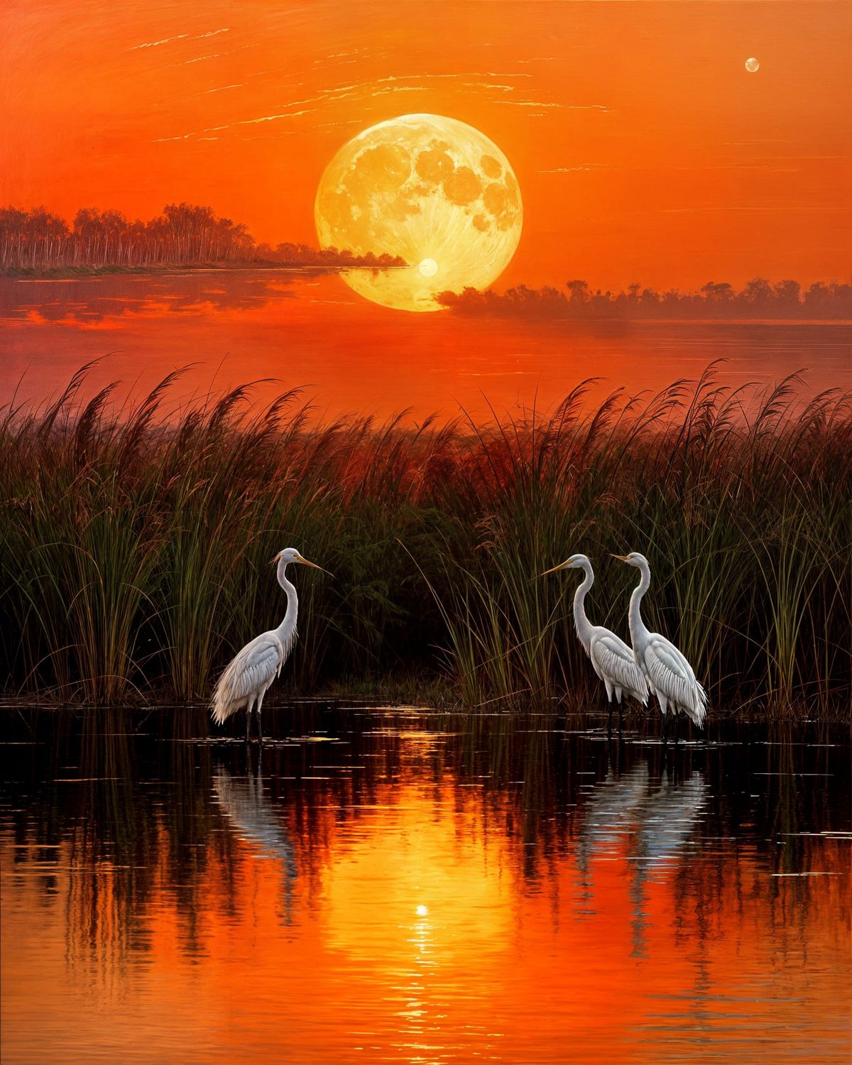 Serene wetland at sunset with tall reeds, calm reflective water, and white herons standing near the shore. A huge glowing full moon rises behind dramatic red and orange clouds, illuminating the scene with warm light. The reflection of the moon glows on the water’s surface. Highly detailed, vivid colors, ...
