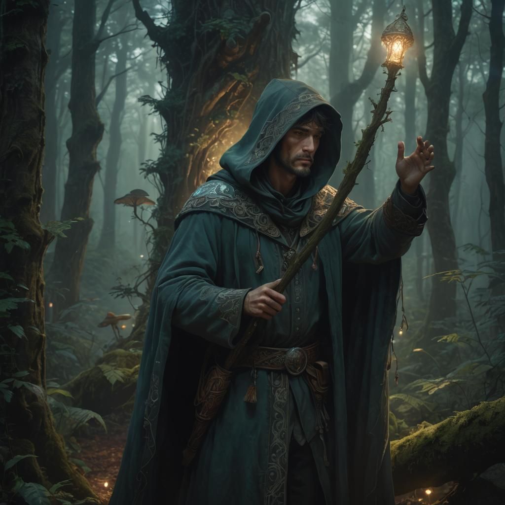 A mesmerizing portrait of a ranger casting a spell in a misty forest. The ranger wears an embroidered cloak with luminescent mushrooms, showcasing Art Nouveau-inspired linework and a triadic color scheme.