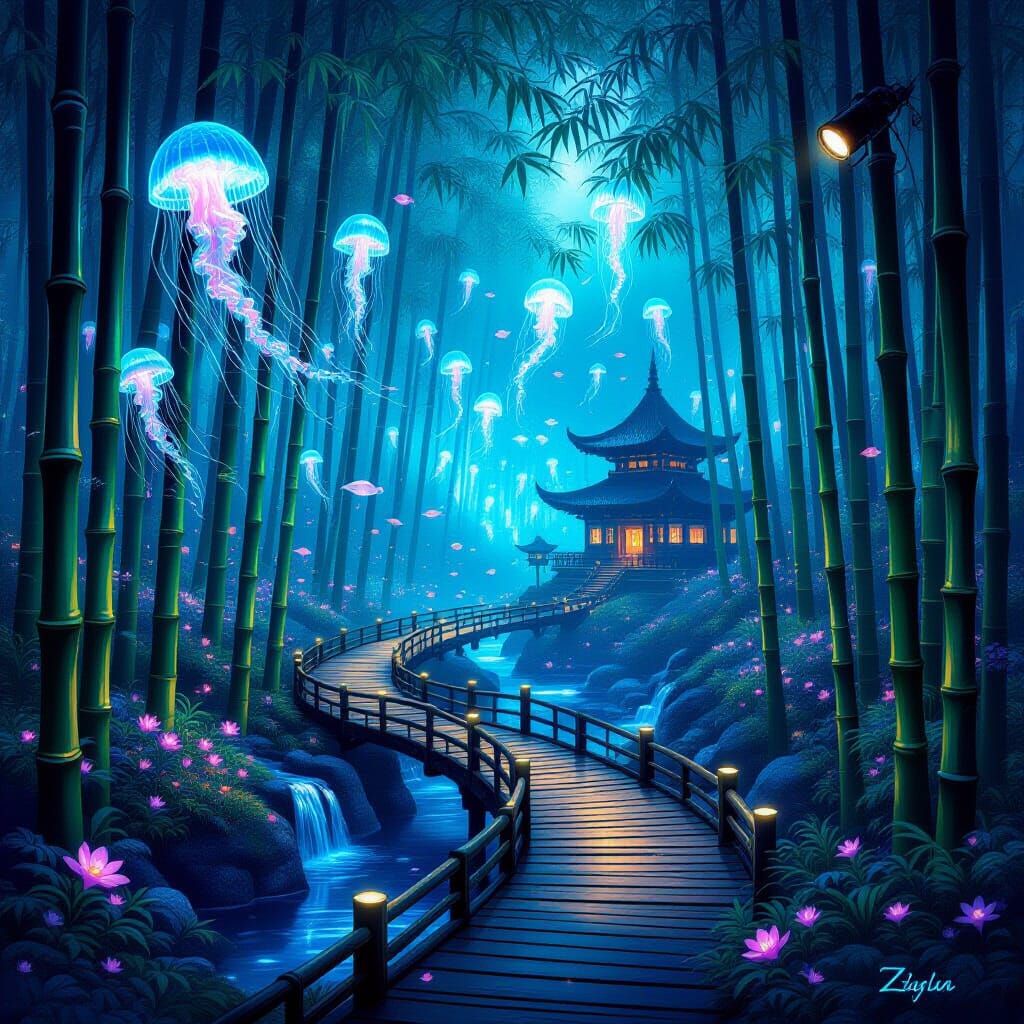 Esta imagen muestra un bosque de bambú fantástico y surrealista con una atmósfera mágica en tonos azules, púrpuras y verdes.