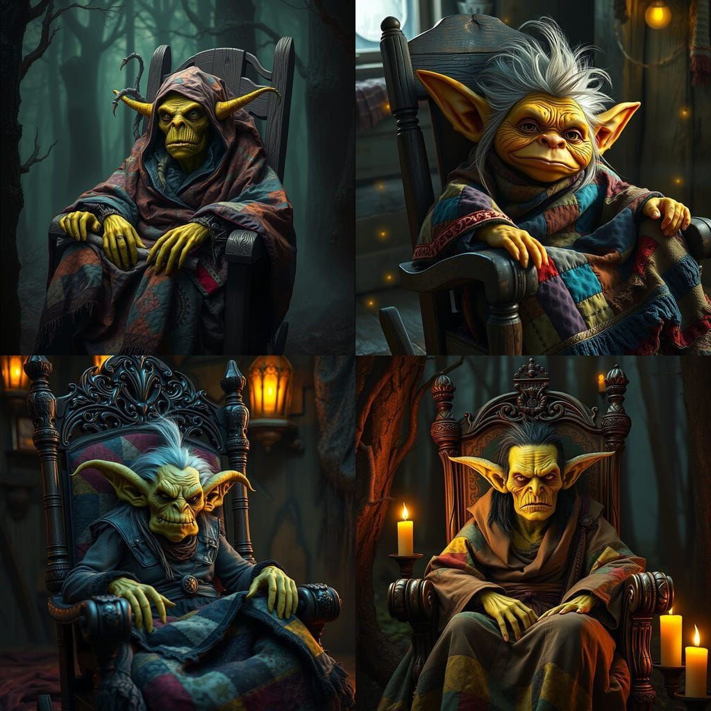 This image depicts a fantastical, evil troll woman sitting in a rocking chair, surrounded by intricately detailed quilts in a rich, deep color palette, evoking a sense of fantasy and wonder.