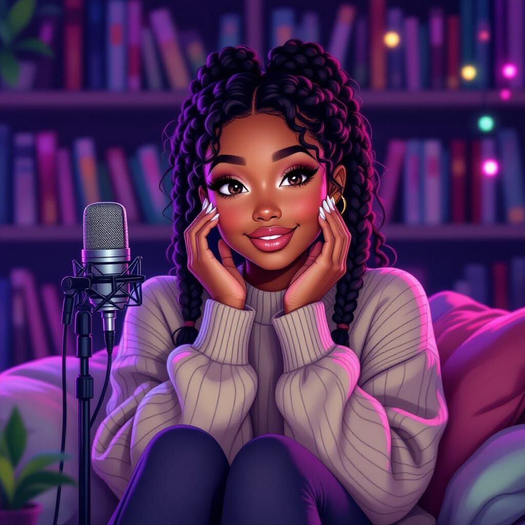 This digital painting captures a cute Black ASMR influencer with dark skin, braids, and an oversized sweater in a cozy home library. Neon lights create a moody, R&B vibe.