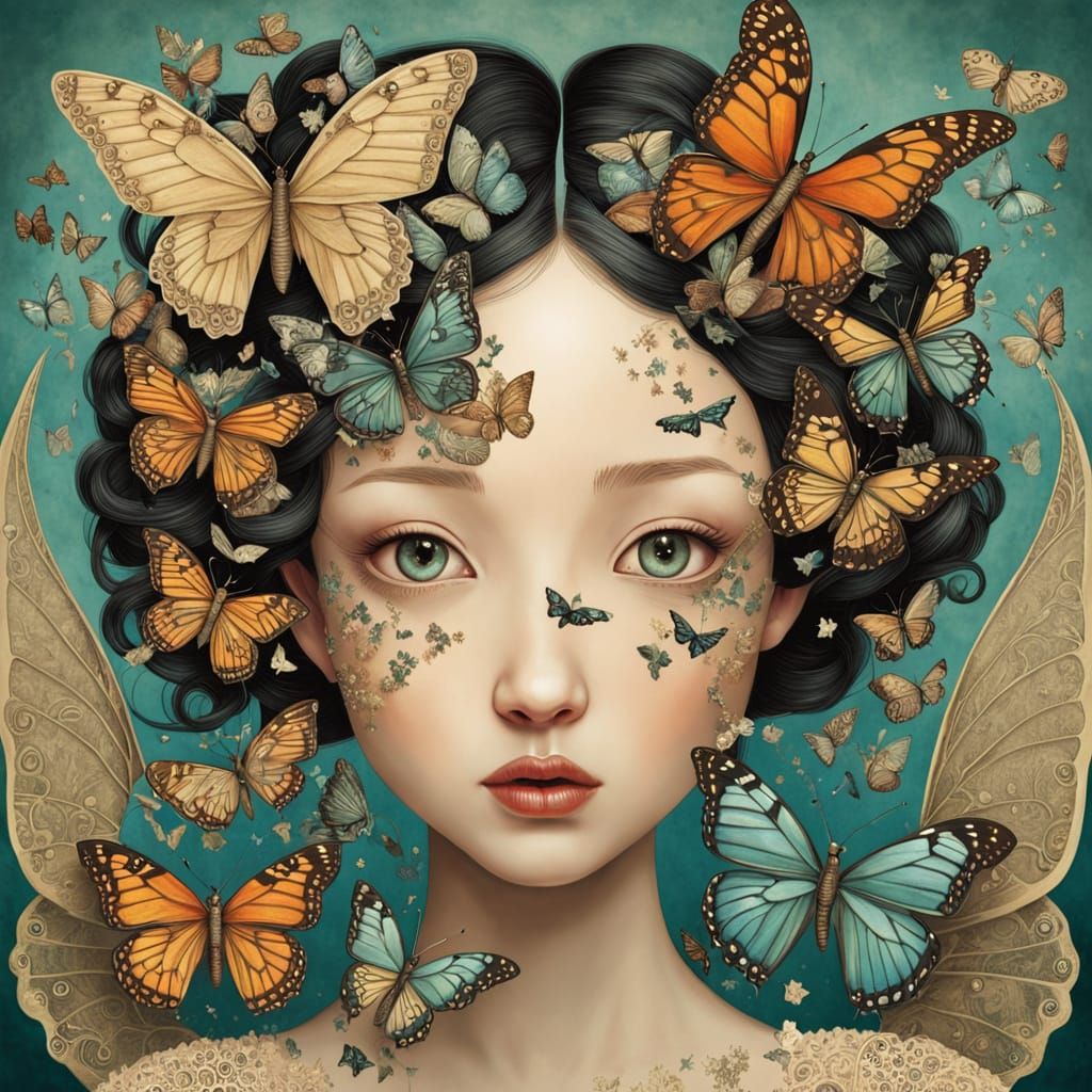 This enchanting artwork is a dreamlike representation of transformation, featuring a caterpillar's journey through chrysalis to butterfly, amidst shattered mirrors and whimsical figurines with expressive faces and delicate wings, blending fantasy and reality in a vibrant tapestry of textures and colors.