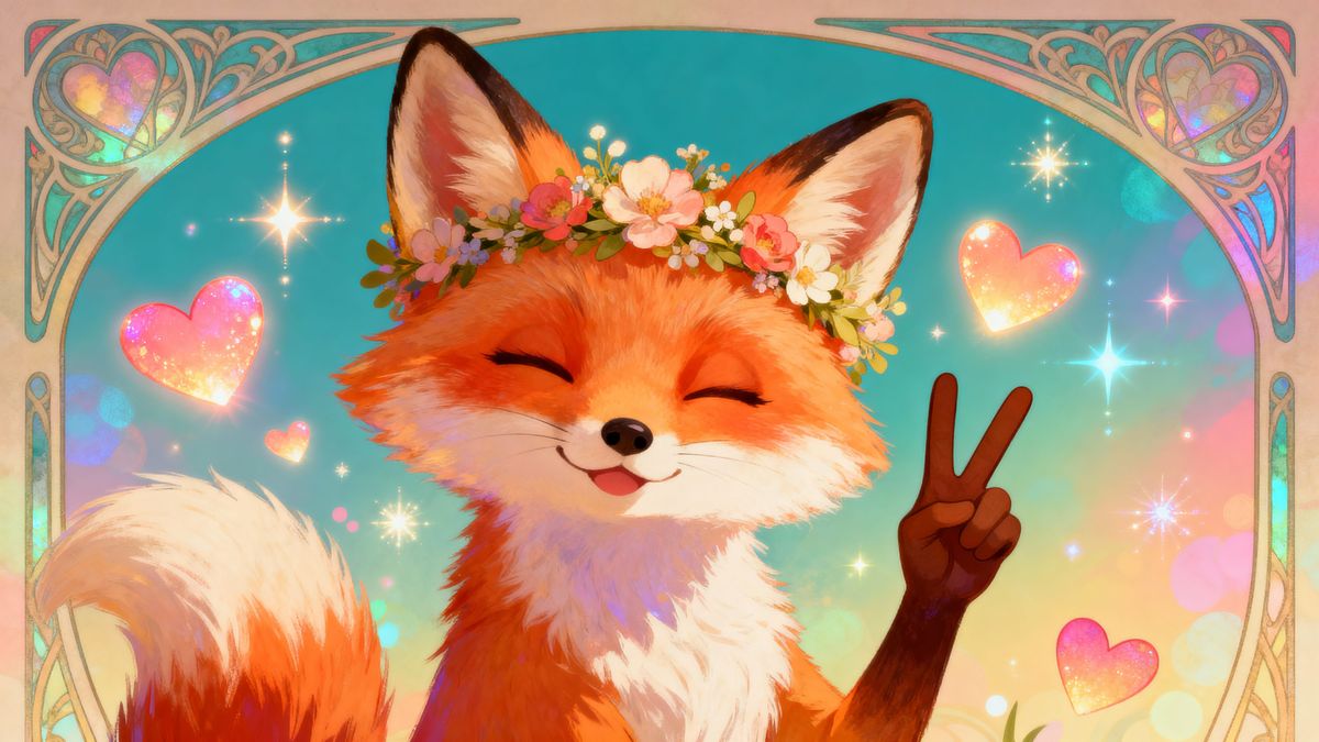 A sweet digital painting of a cute fox with fuzzy ears, wearing a flower crown and making a peace sign. The vibrant scene symbolizes luck and happiness with hearts and sparkles.