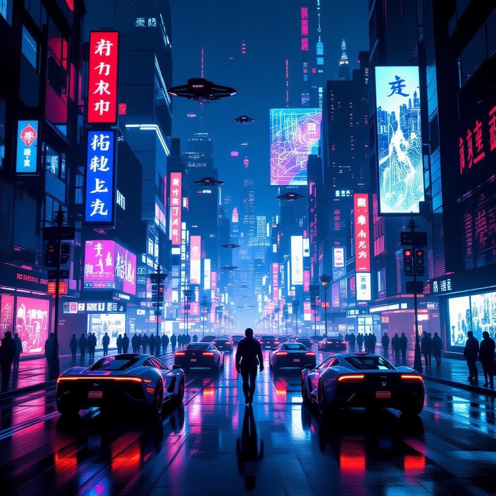 Generate your unique neon-lit futuristic street scenes with flying cars and hologram ads. Free and easy AI art creation.