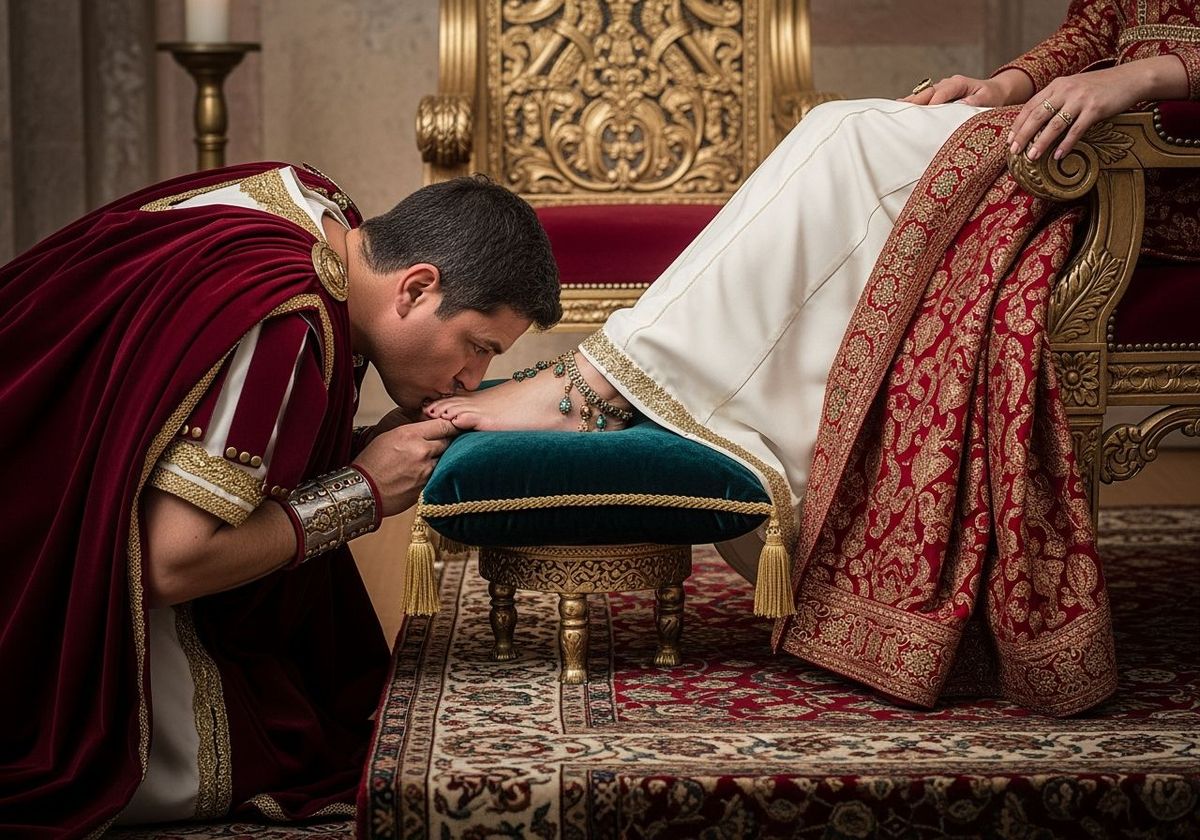 This image depicts a Roman servant kneeling to kiss the feet of his Empress. Shot in a professional photography style, it features soft, natural lighting and a sharp focus, reminiscent of classic portraiture.
