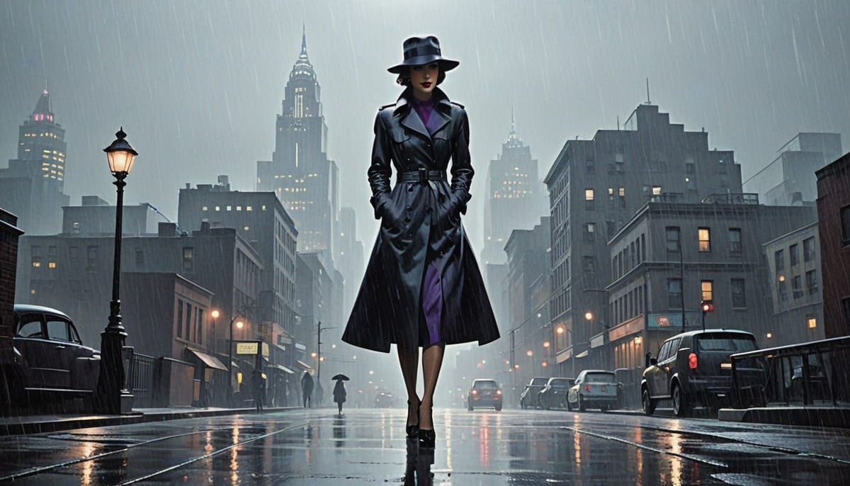This image depicts a woman shrouded in mystery amidst the glamour of Art Deco architecture in a dark and alluring night setting, evoking the intrigue of a classic noir painting.