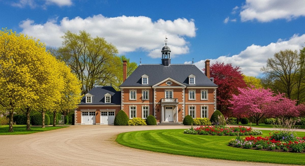 A stately brick chateau with a black roof is surrounded by colorful trees and a flower garden under a blue, cloudy sky. Rendered with visible brushwork and rich textures in an impressionistic style.