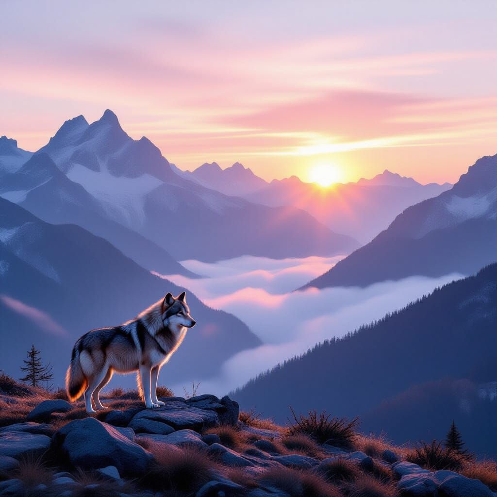 This image shows a majestic wolf guarding a peaceful mountain landscape. Soft pink and gold hues paint the sky as mist clings to the valleys, creating an ethereal atmosphere.
