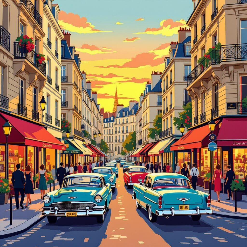 This vibrant illustration captures a bustling 1960s Parisian street with vintage cars and stylish pedestrians. Bathed in golden hour light, it emulates mid-century European travel poster art.