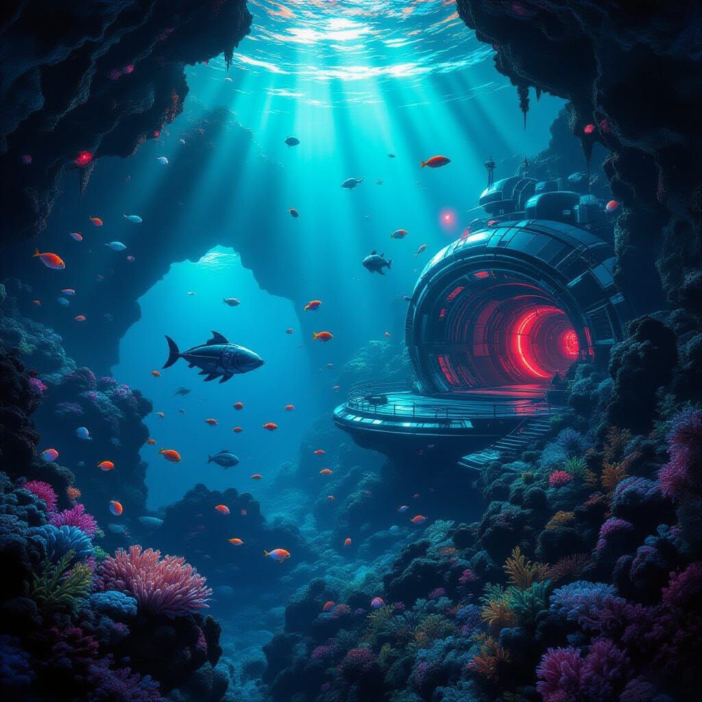 This image depicts a vibrant coral reef with glowing fish and plants, concealing a futuristic supervillain lair within coral caves. Ominous red lights and mechanical guardians contrast with the reef's beauty, in a detailed, cinematic, deep-sea style.