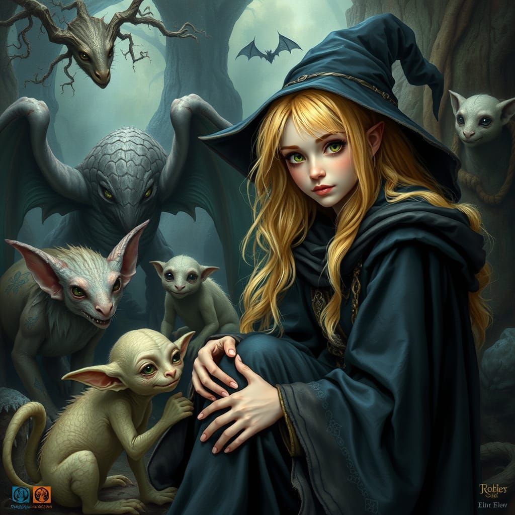 A magical scene of a blonde witch amidst mythical creatures and Dobby. The artwork evokes a whimsical and dreamlike quality, with intricate, mystical details inspired by fantasy art.