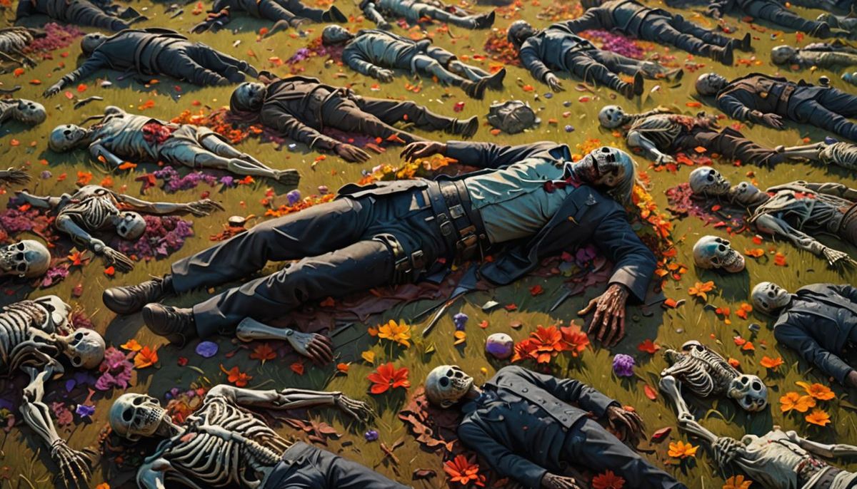 This image shows a hyperrealistic field of fresh corpses, depicted with intricate detail. The mid-shot composition, dramatic lighting, and colorful background enhance the unsettling subject matter.