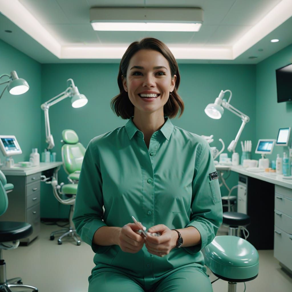 Cinematic film still of a woman in a dental practice, holding a mirror. The scene features bright lighting, gleaming equipment, and a professional yet quirky atmosphere.