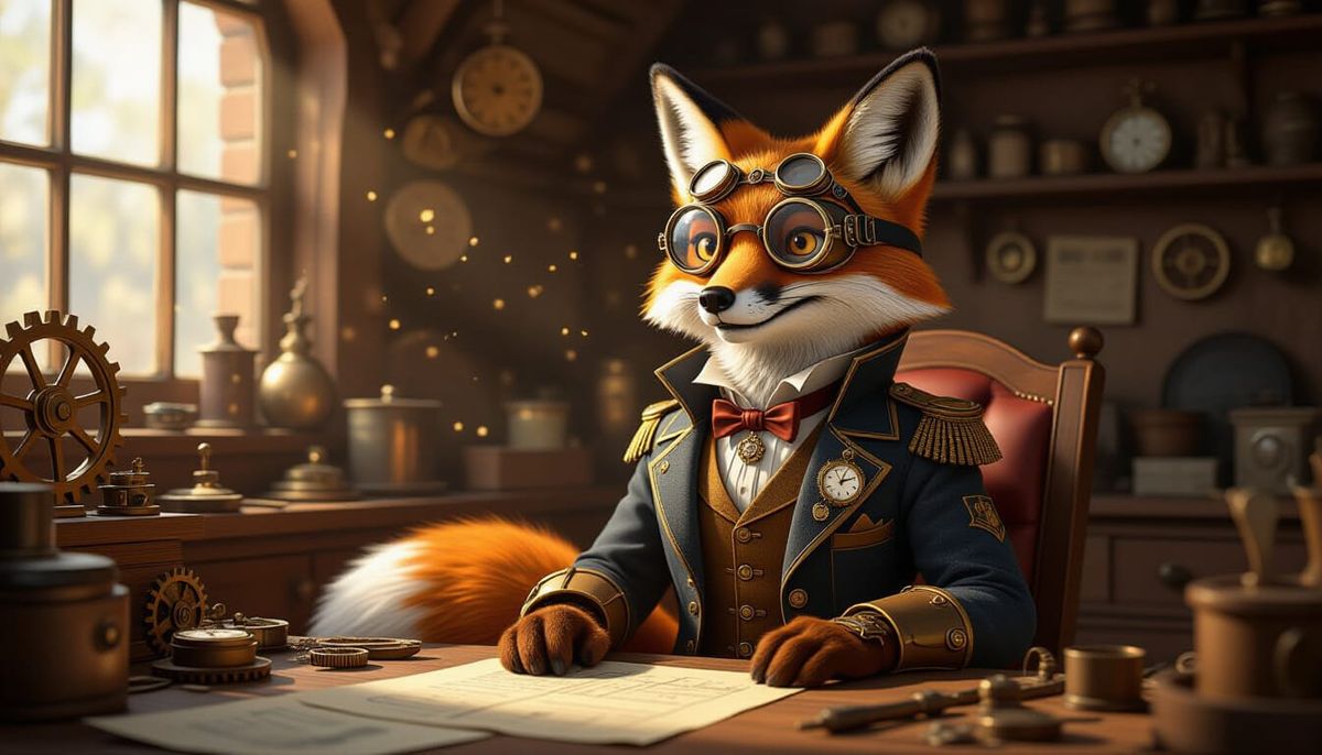 A charming anthropomorphic fox inventor in a steampunk outfit works in a cluttered workshop filled with gears and tools. Warm light illuminates dust motes in this storybook illustration with photorealistic detail.