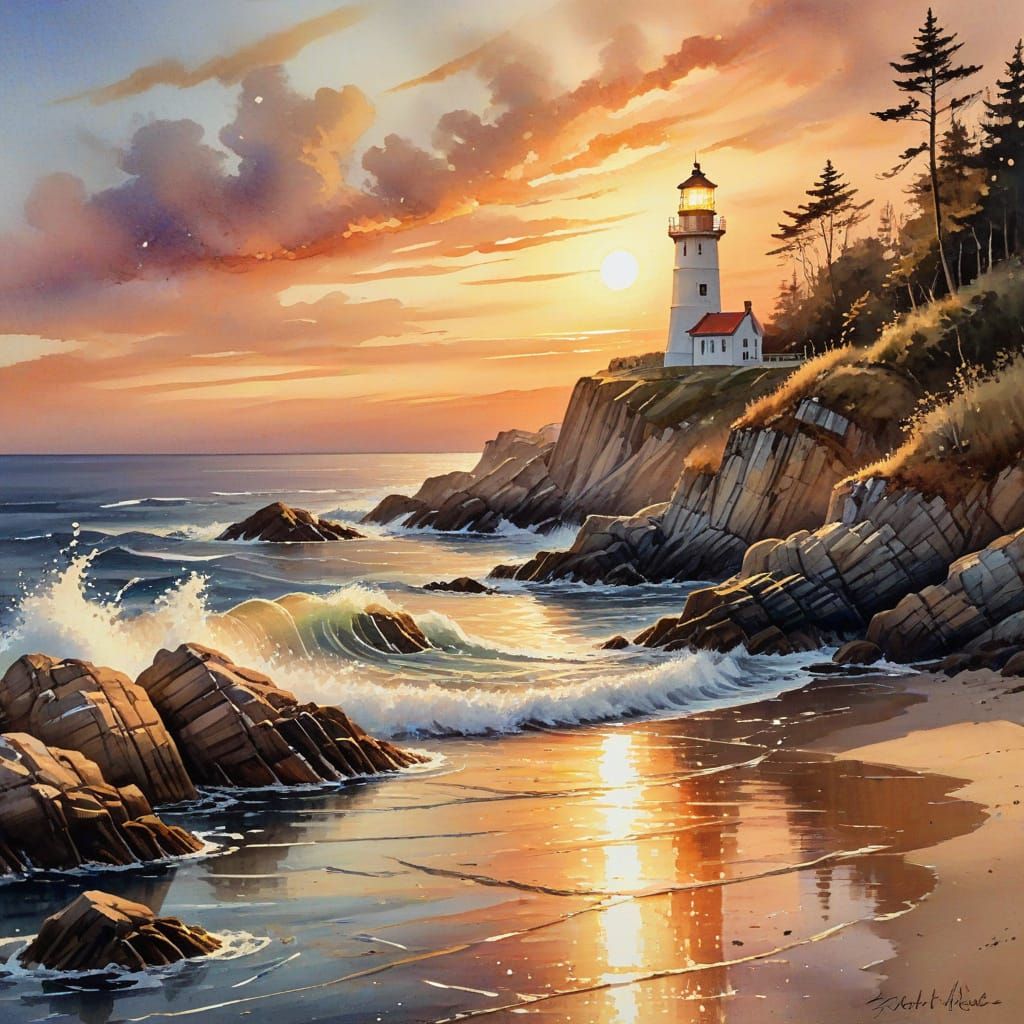 This image shows a lighthouse at sunset, rendered as a watercolour painting. The artwork features soft brushstrokes, warm colours, and golden light shimmering on gentle waves and rocky shores. The overall aesthetic is serene and dreamy.