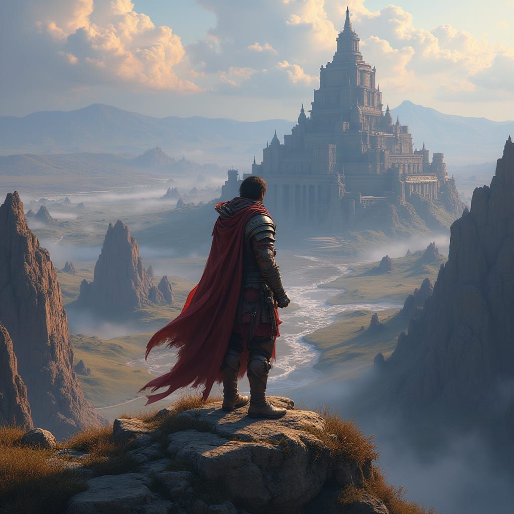A lone warrior surveys a Hyborian Age landscape from a mountaintop. The scene features detailed ruins and mystical artifacts, rendered as a matte painting with rich colors evocative of concept art.