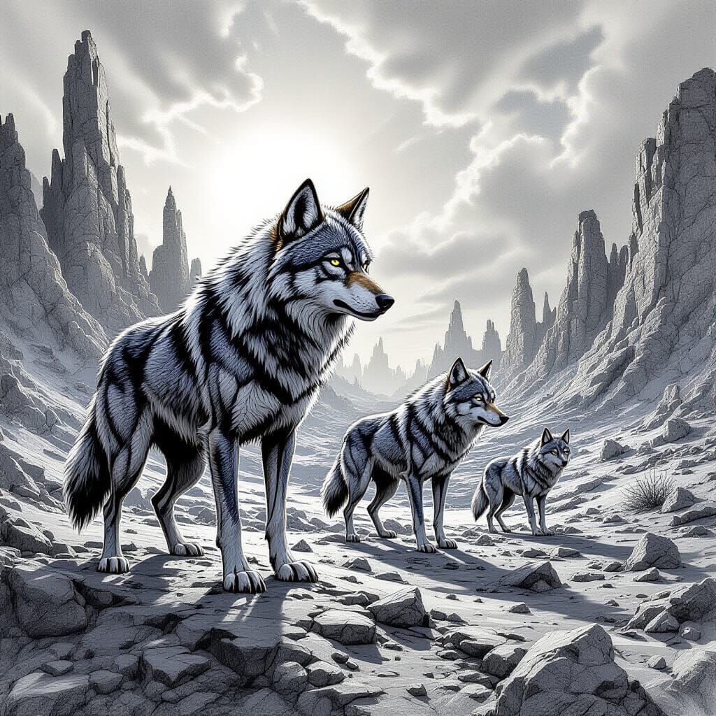 A highly detailed pencil sketch of anthropomorphic wolves in a post-apocalyptic world. Features intricate patterns, bismuth formations, and tetradic colors with dramatic lighting, resembling a gritty stock photo.