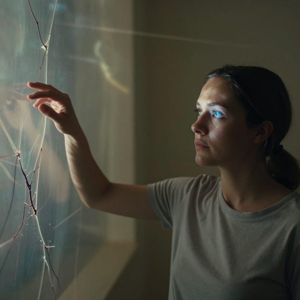 This image captures a woman in a medium close-up, her arm reaching for a pulsing, translucent object. Cinematic realism and volumetric lighting enhance the symbolic, contemplative mood.