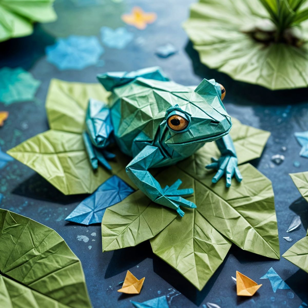 A vibrant image of a textured origami frog in an origami pond, surrounded by origami fauna. The artwork evokes a playful, paper-crafted aesthetic.