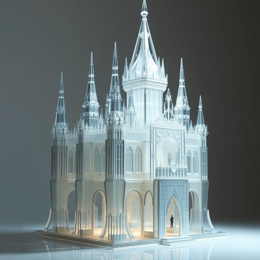 A striking picture of a fragile yet imposing glass castle. The architecture features sharp, jagged edges, with intricate details that reflect light, rendered with a futuristic and elegant aesthetic.