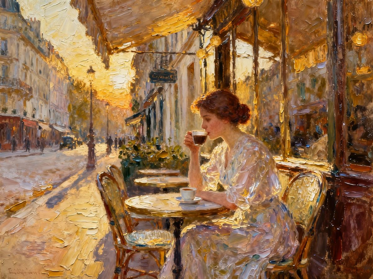 A woman sips coffee at a sidewalk cafe, captured with impressionist light and photorealistic urban views rendered in translucent colored wax.
